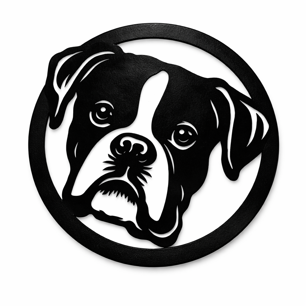 This Boxer Metal Wall Round features a clean, bold silhouette that highlights the unique expression and character of the breed. Precision cut from durable steel and finished in satin black powder coat, it creates striking contrast against light or neutral walls.