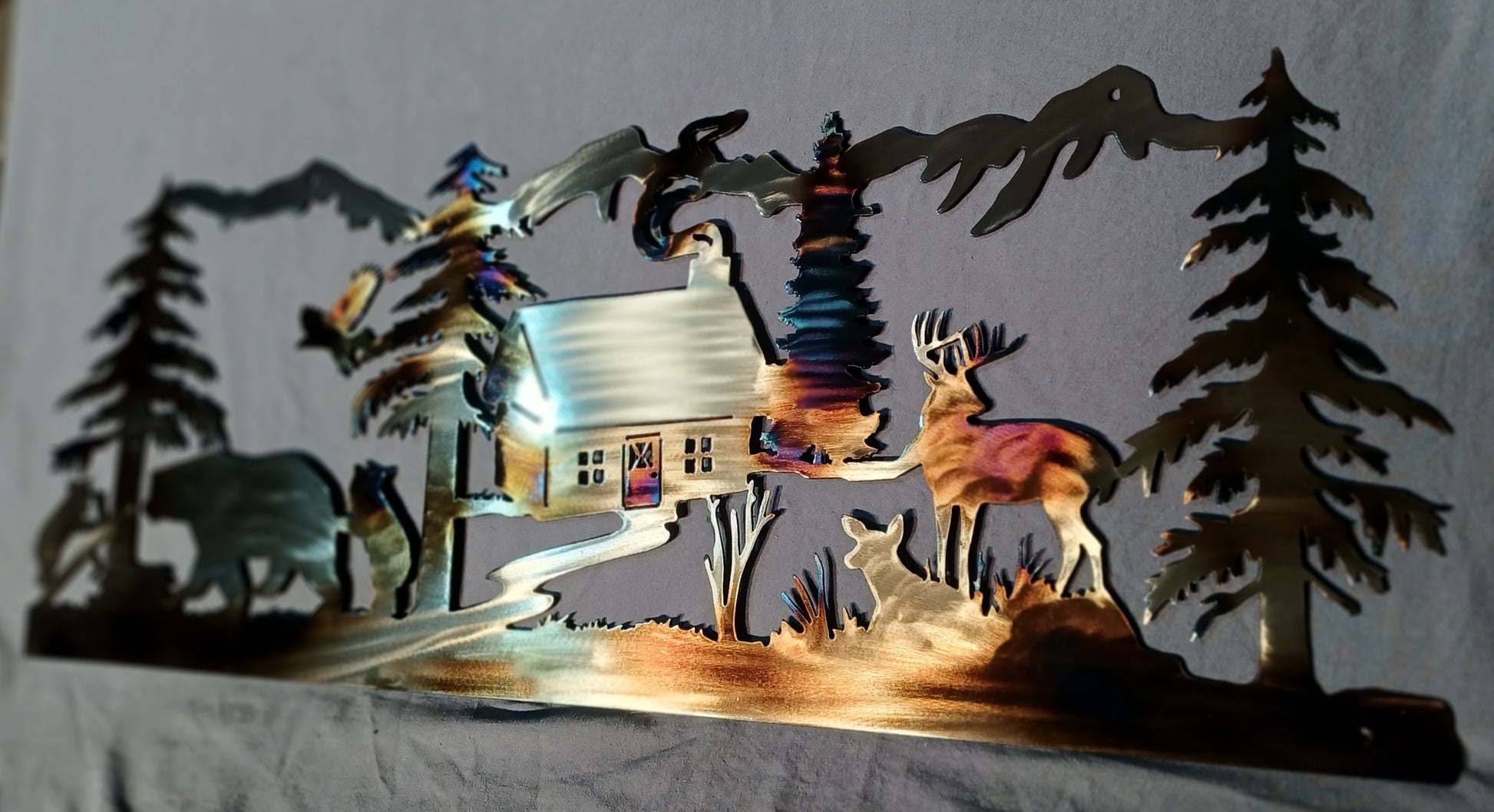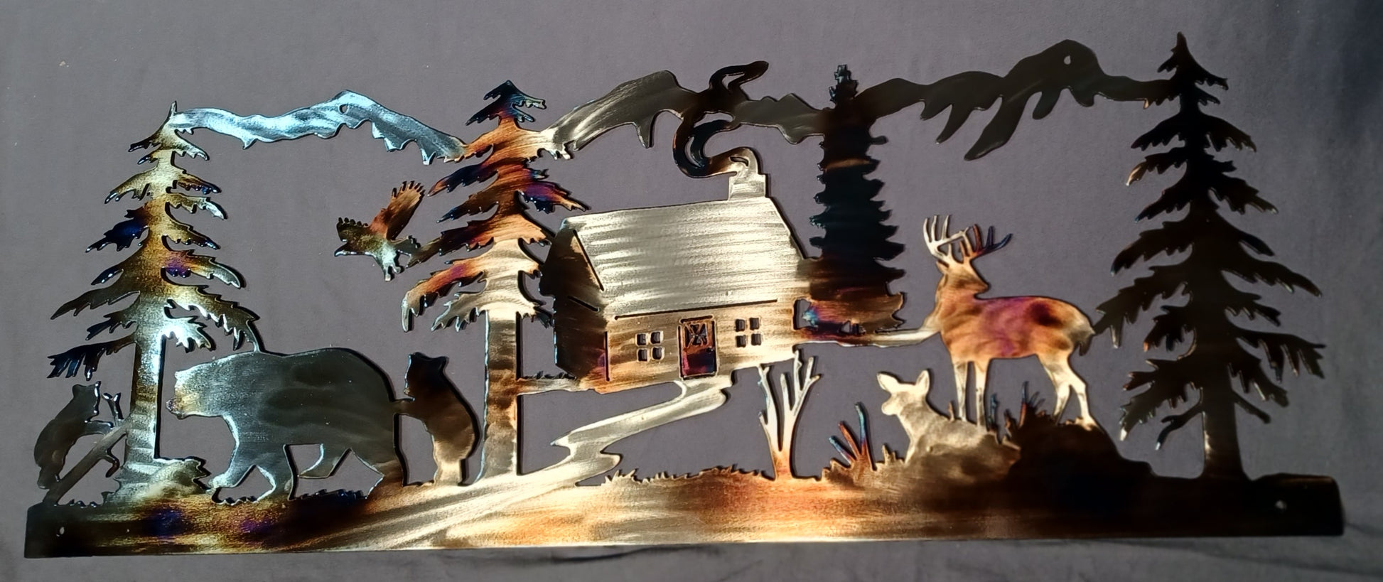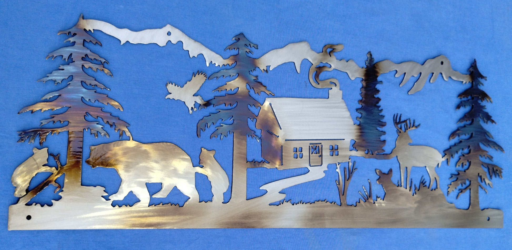 A clear powder coat adds subtle gloss and protects your art for display indoors or outdoors, making it perfect for cabins, campers, entryways, and rustic home décor.