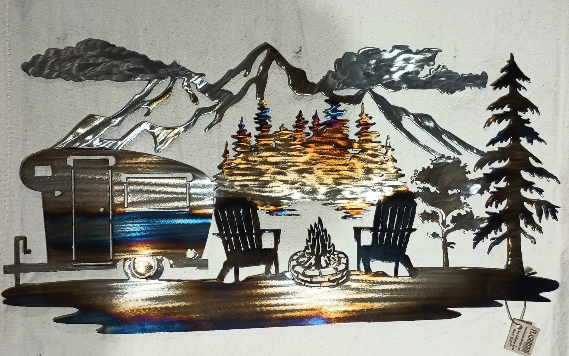 There’s nothing quite like the glow of a campfire beneath a mountain sky — and this handcrafted metal art captures that magic in steel. Featuring a cozy old-style camper nestled in the pines, a flickering fire, and mountain silhouettes in the background, this piece brings rustic charm and outdoor spirit to any space.