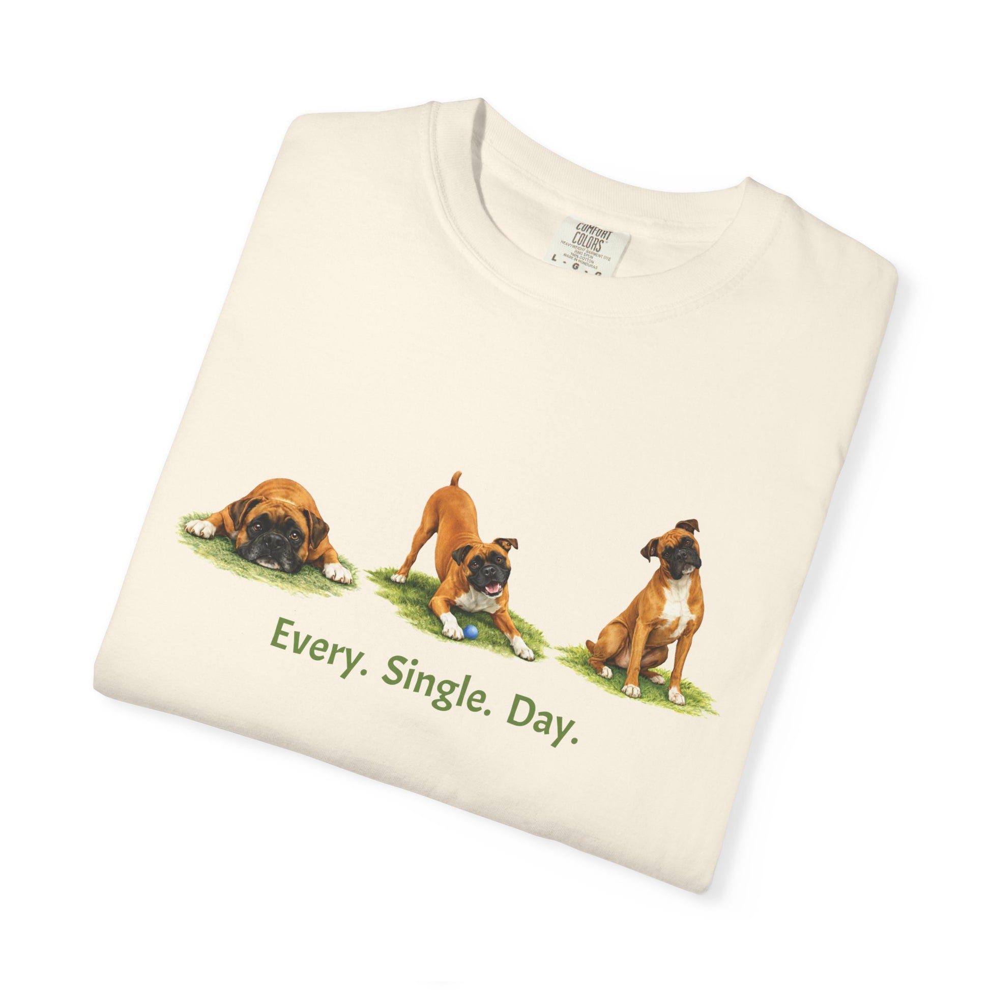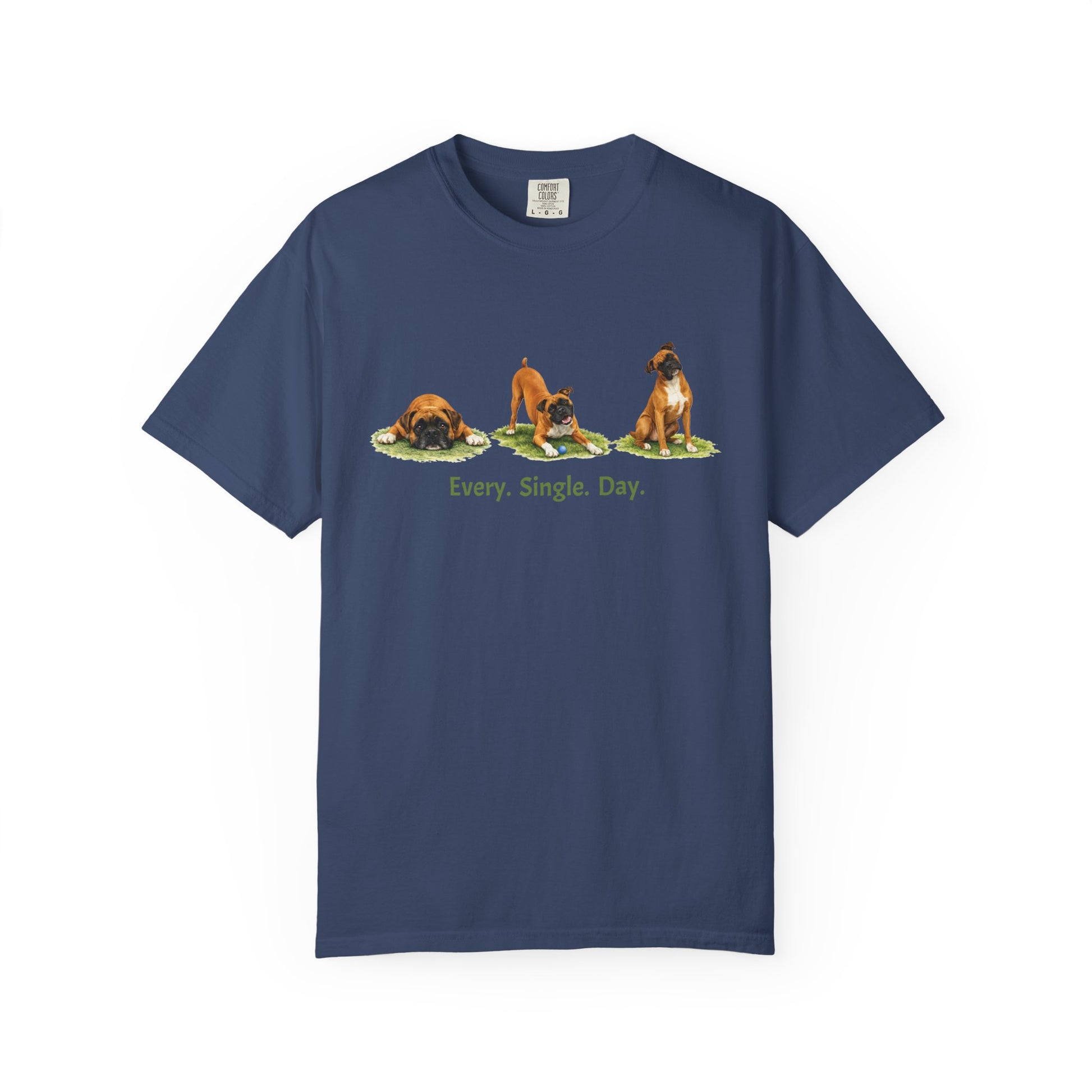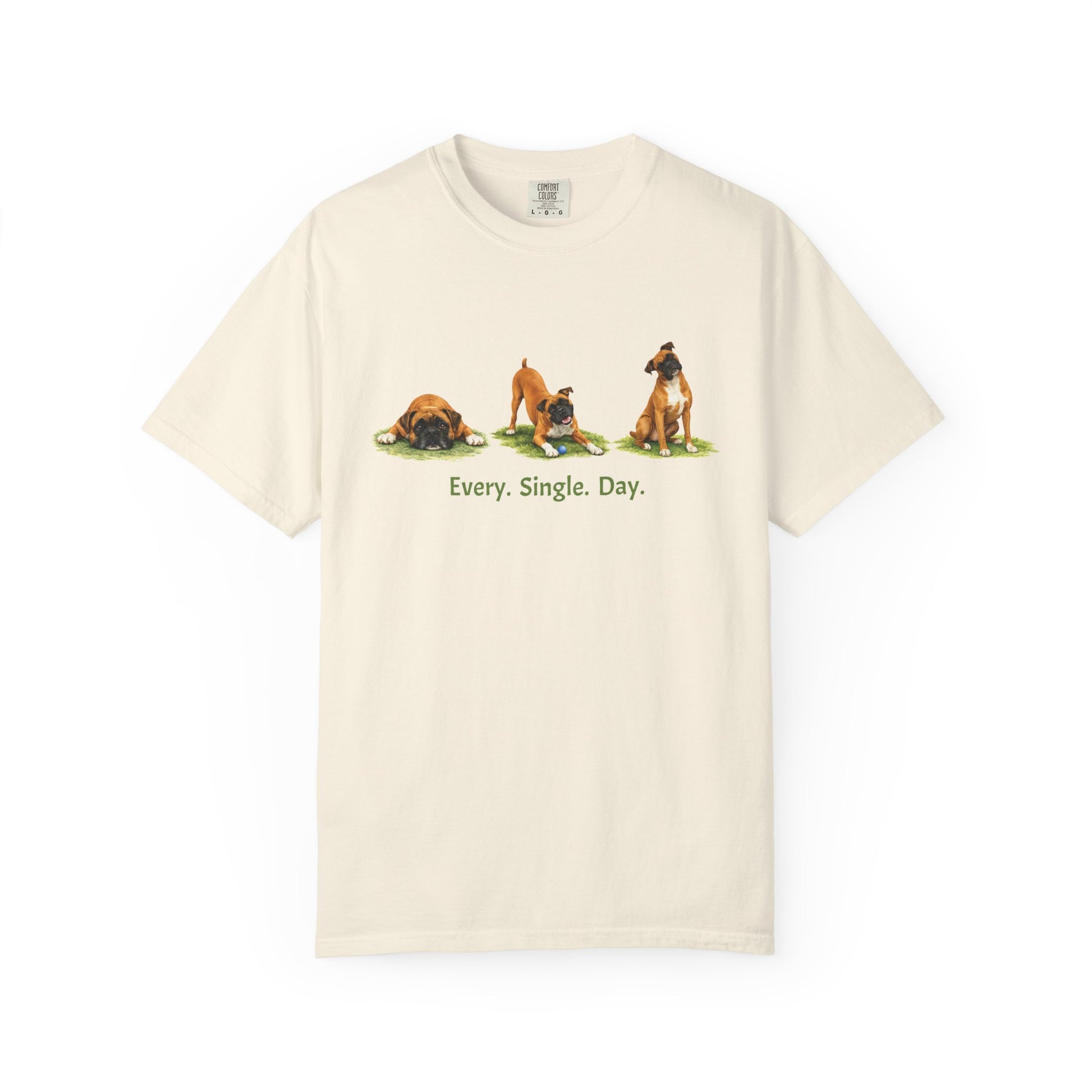 This illustrated design captures the full daily Boxer routine in three perfectly recognizable moments: the floor melt, the play bow, and the classic sit-and-study stare. If you know, you know.