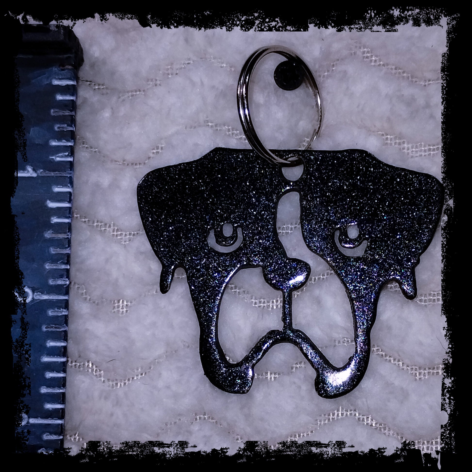 This is our Boxer Keychain. It is made of 16ga metal, sanded and powder coated in black, brown or white. It comes with a 1" split key ring.
