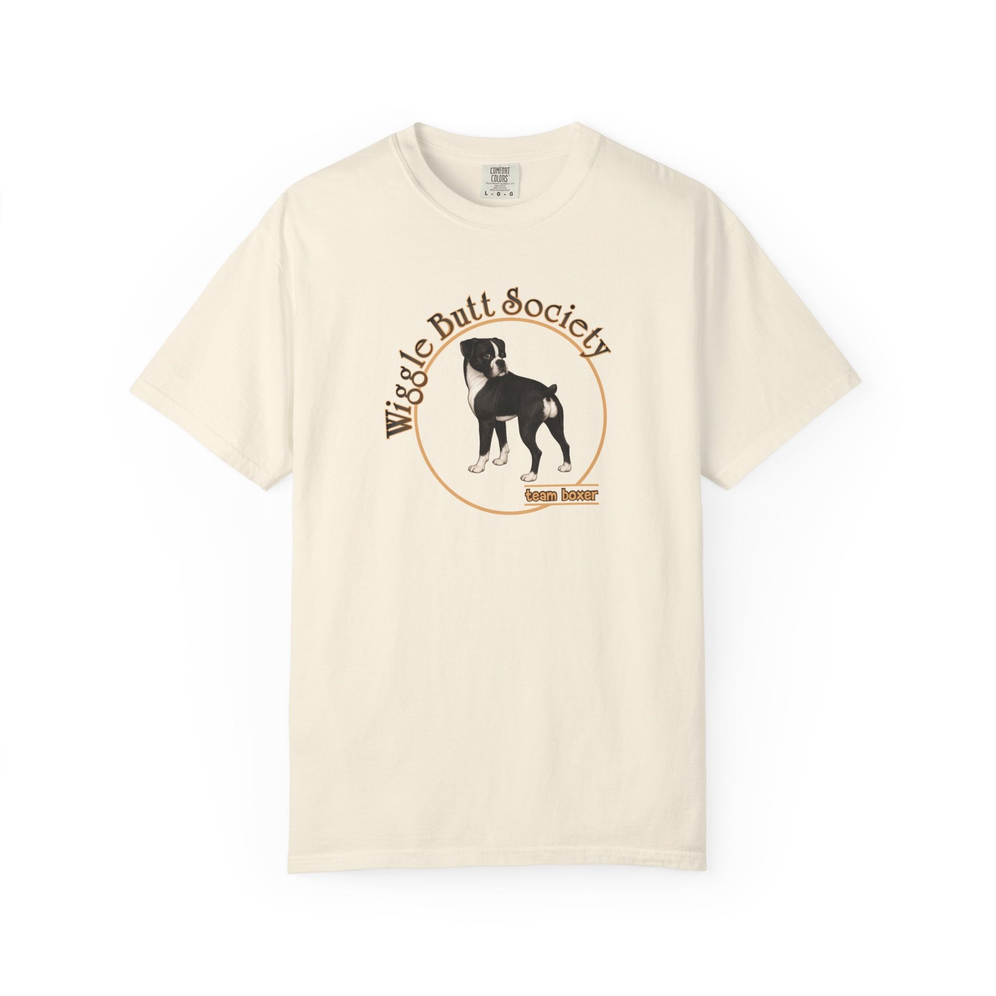 This Team Boxer t-shirt features the classic Wiggle Butt Society logo paired with a hand-drawn Boxer illustration and bold Team Boxer lettering on the front. Clean, simple, and easy to wear, it’s designed for everyday life - dog park runs, errands, couch snuggles, and everything in between.