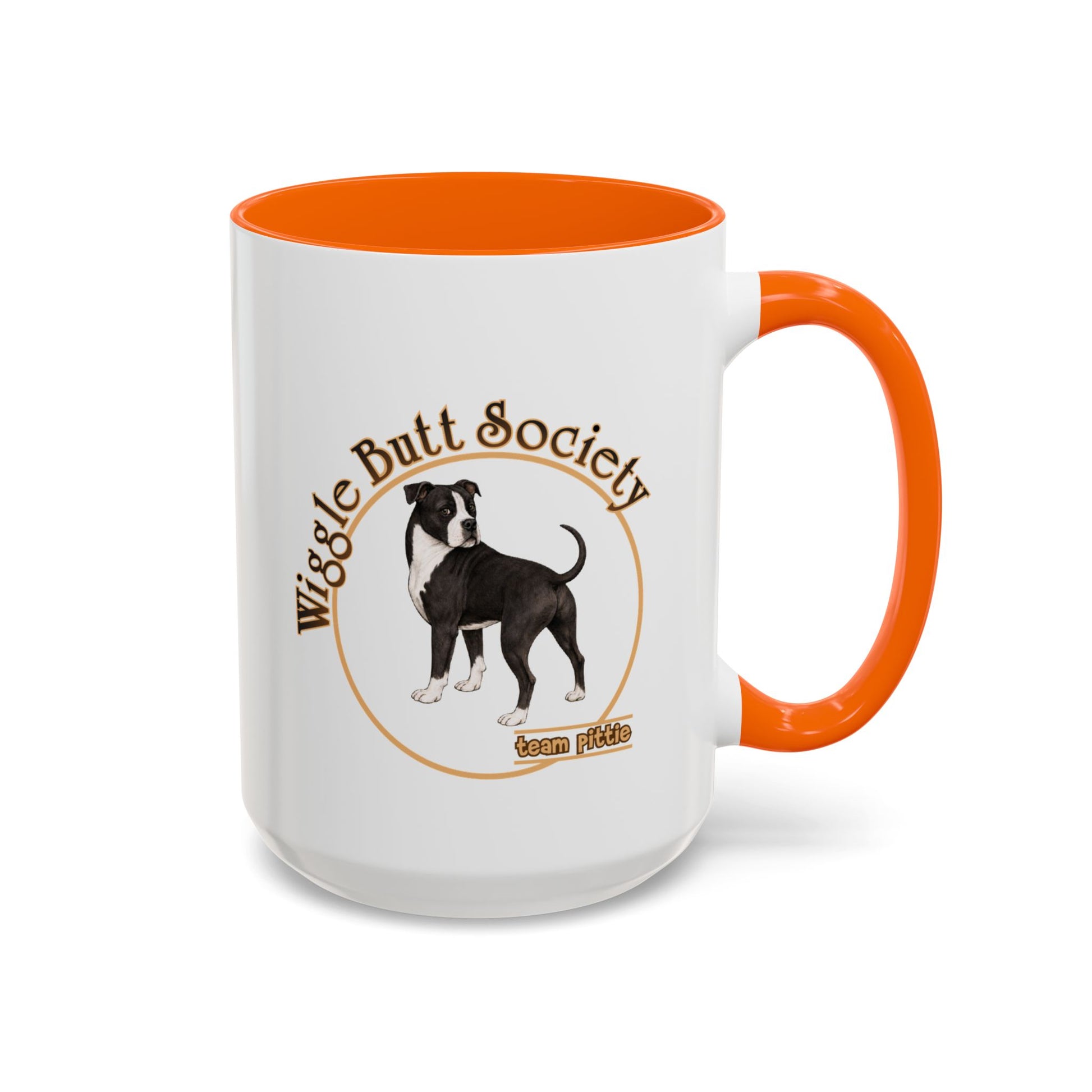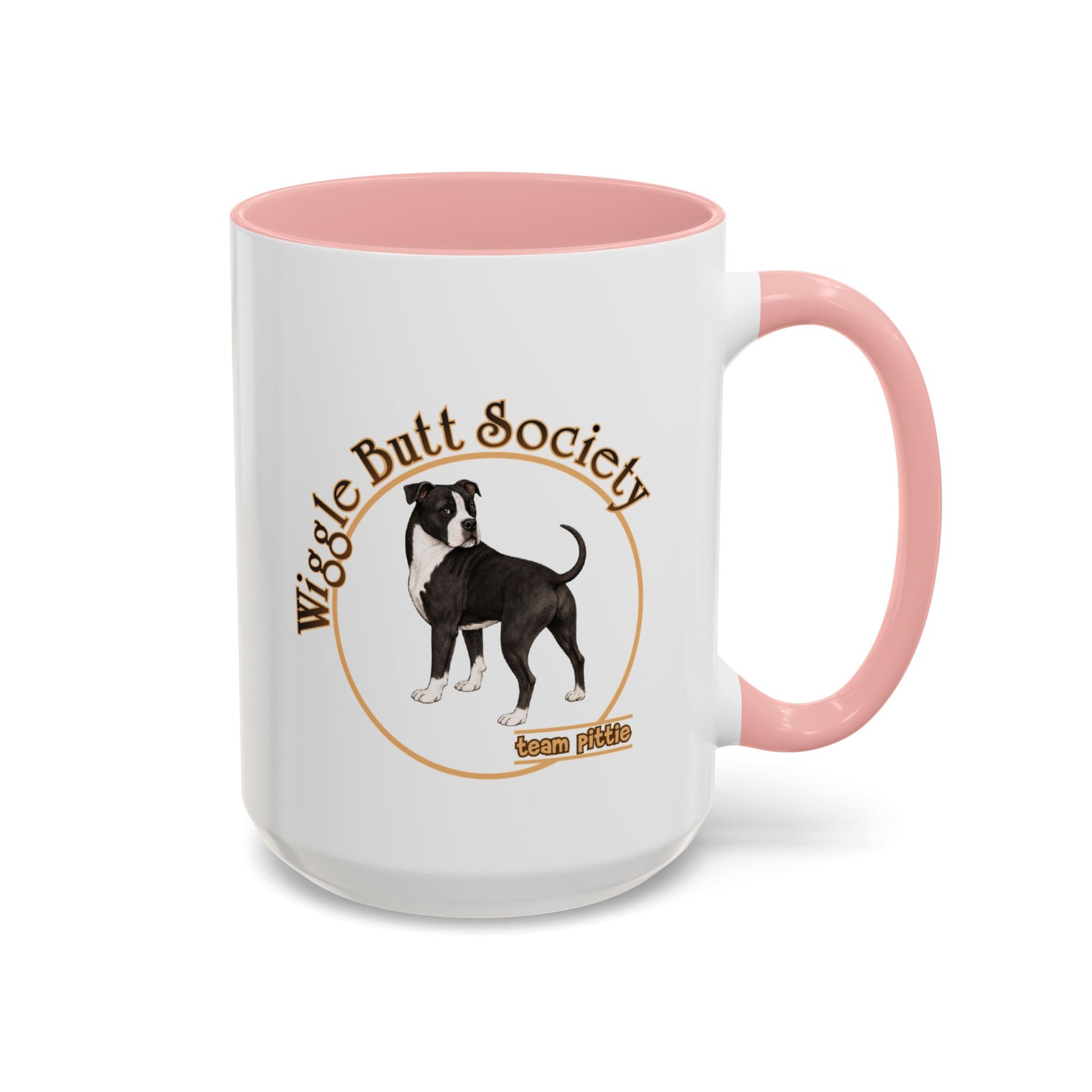 This Wiggle Butt Society logo accent mug features a hand-drawn pittie illustration with bold Team Pittie lettering on both sides. Clean, simple, and full of breed pride, it’s made for the ones who start their day with coffee and a little pittie personality.